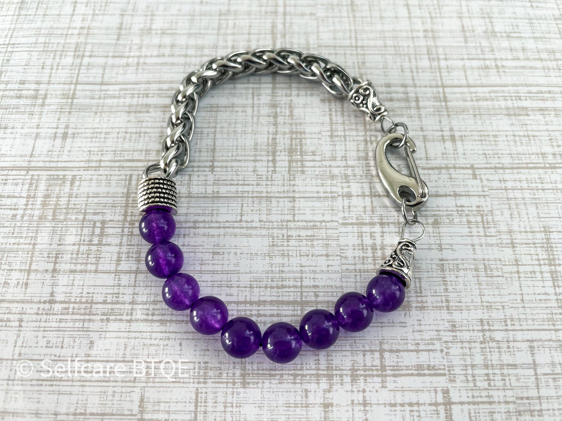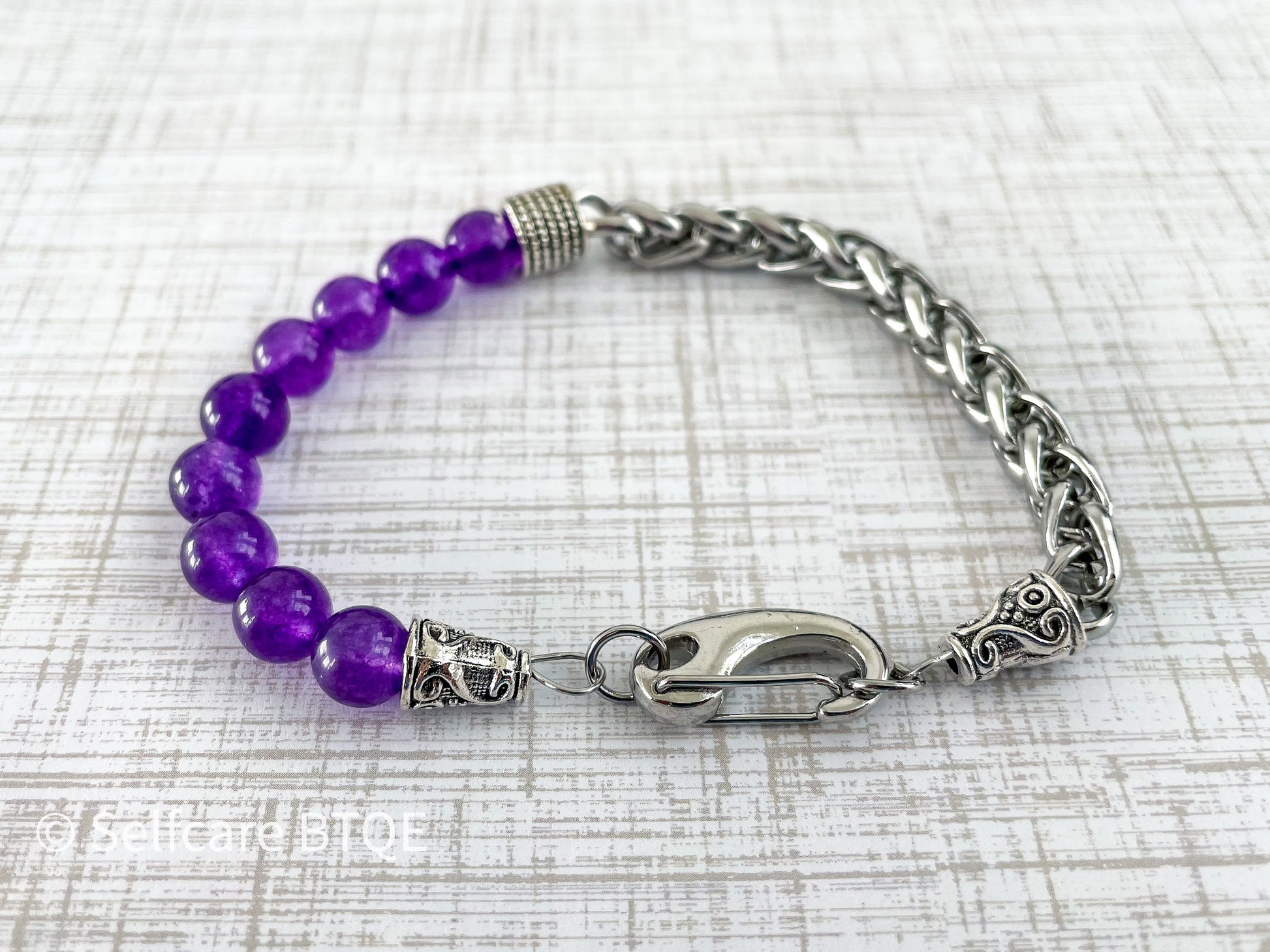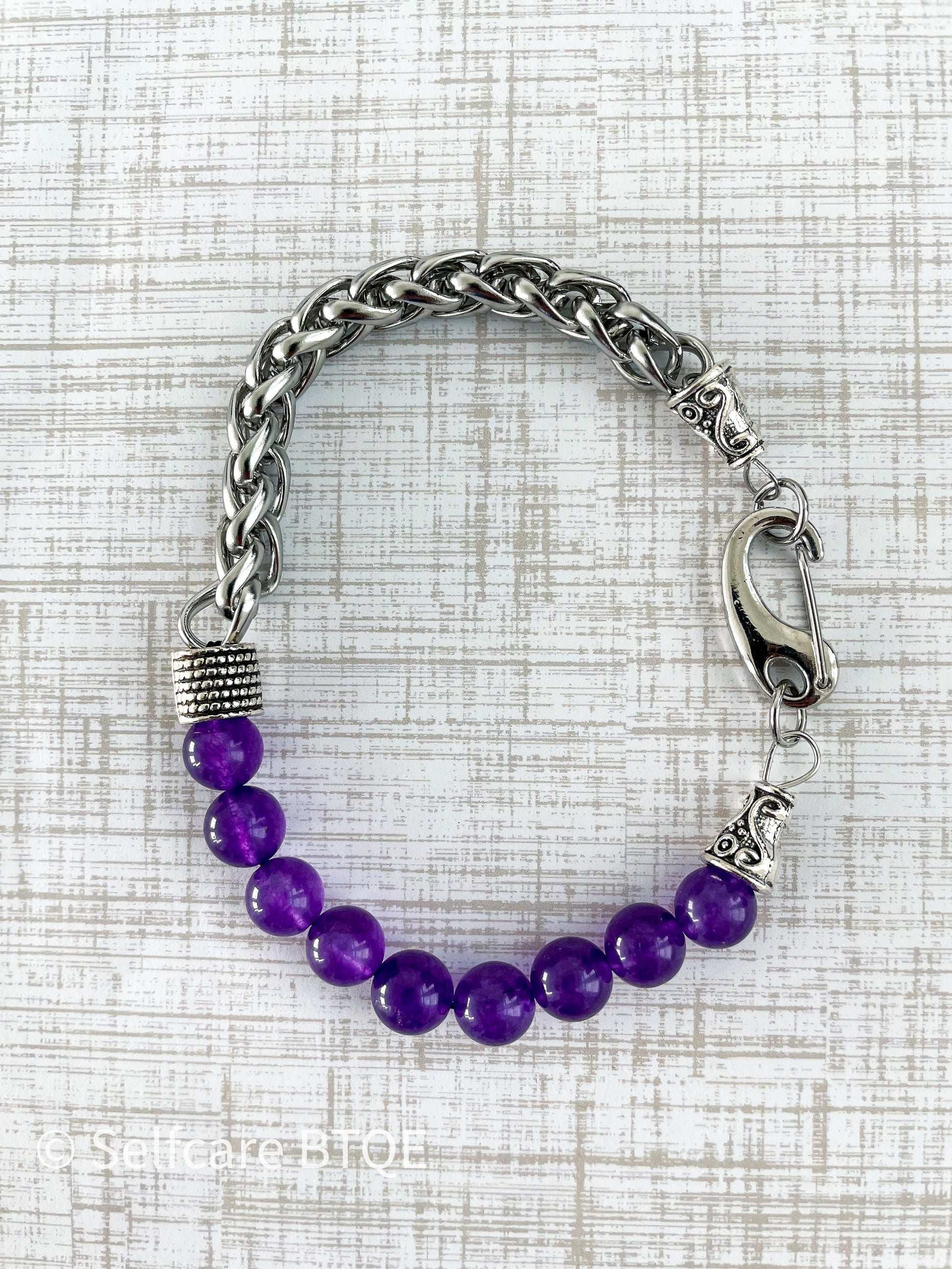 Create an atmosphere of tranquility, calm and balance with this all exquisite Amethyst bracelet. There are 9 - the universal numeric symbol of love and faith, natural amethyst stones roped together a stainless steel chain to create this snazzy bracelet for men. Genuine Amethyst Stone with a refractive index of 1.54 – 1.5. Fits wrists up to 8.5." Hit the buy now button to get yours today.