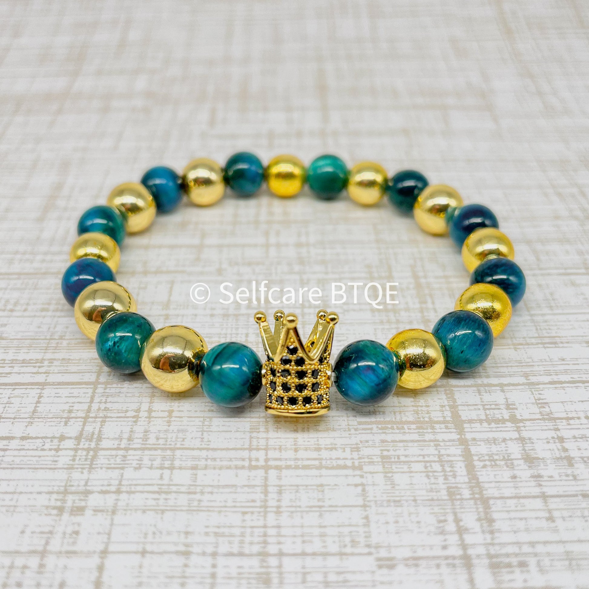 This bracelet features rare, deep-green Tiger’s Eye beads that shimmer with a mysterious, chatoyant light. Interspersed with high-shine gold accents and centered by a regal, pave-set Golden Crown, it serves as a daily reminder that you are the architect of your own destiny.