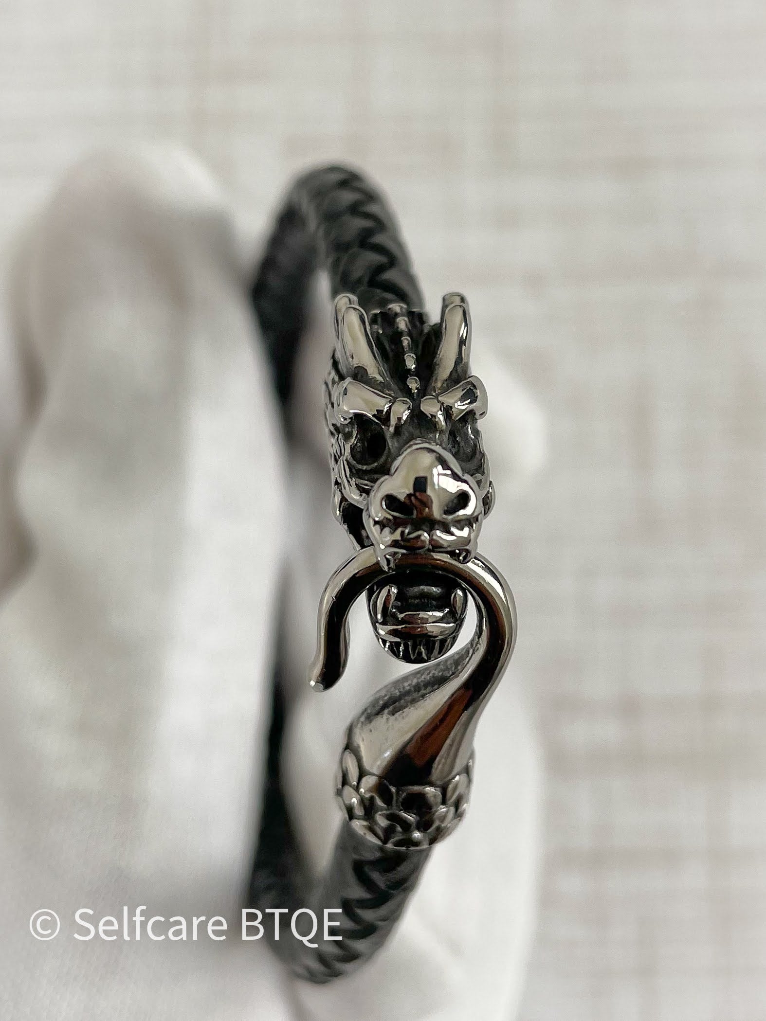 - This bracelet, made from genuine leather, features a 316L Stainless Steel dragon clasp.